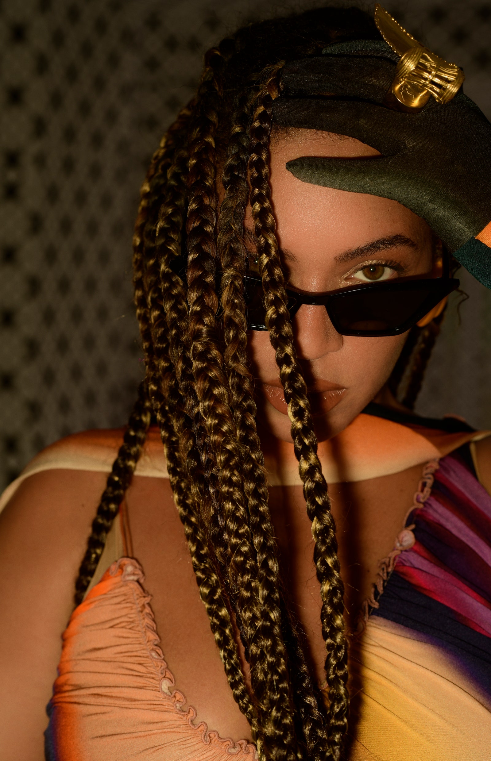 Beyoncé closes in Power with custom Spring 2020 Mugler with waist-length goddess braids, which curl at the ends.