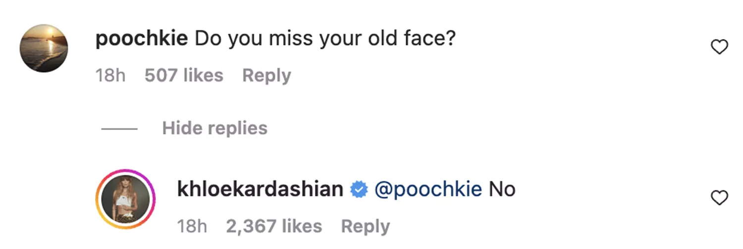 “Do you miss your old face?” a third wrote. And to that, rather than defend her own choices, Kardashian hilariously responded, “No.”