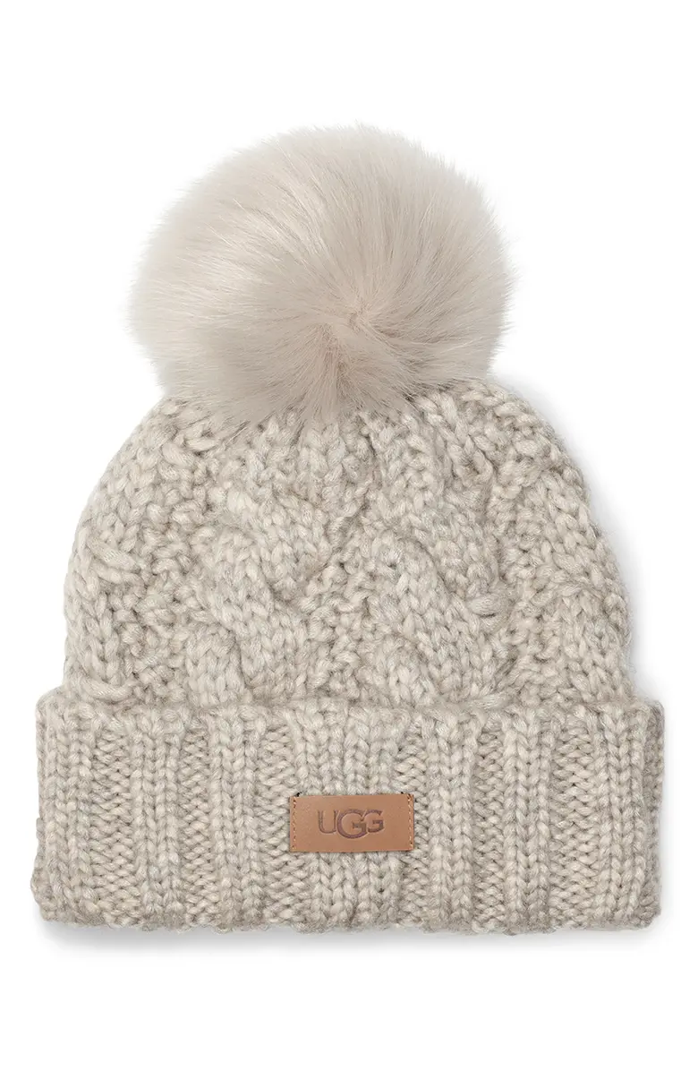 A soft faux fur pom crowns a chunky cable-knit beanie detailed with a fold-over ribbed cuff that adds extra warming coverage over your ears.