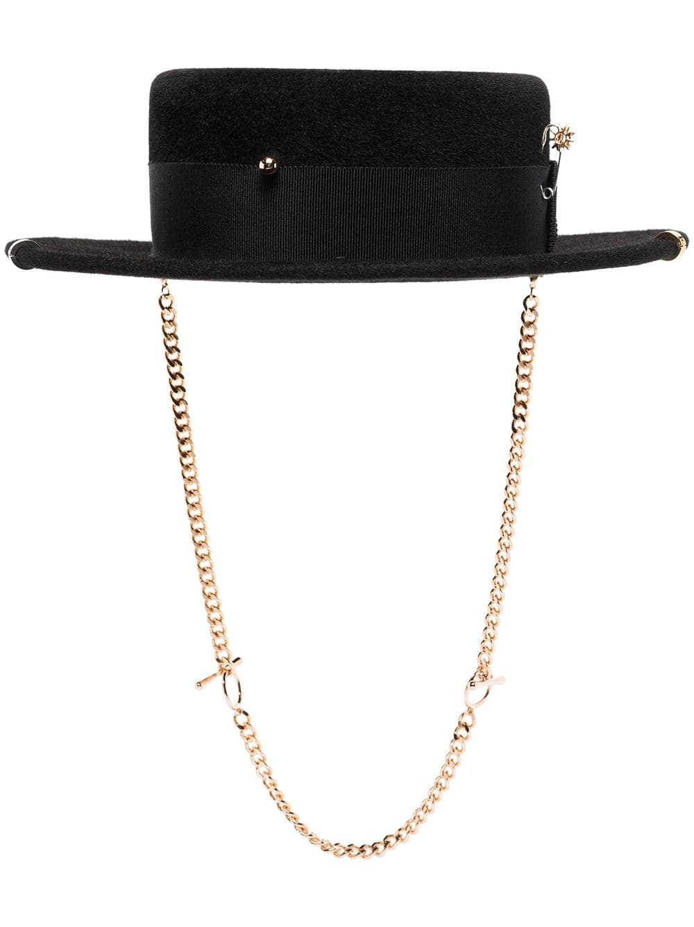 Guess what. The beanie’s out. The boater’s in. This black felt chain strap boater hat from RUSLAN BAGINSKIY, to be precise. Time to add it to your collection.