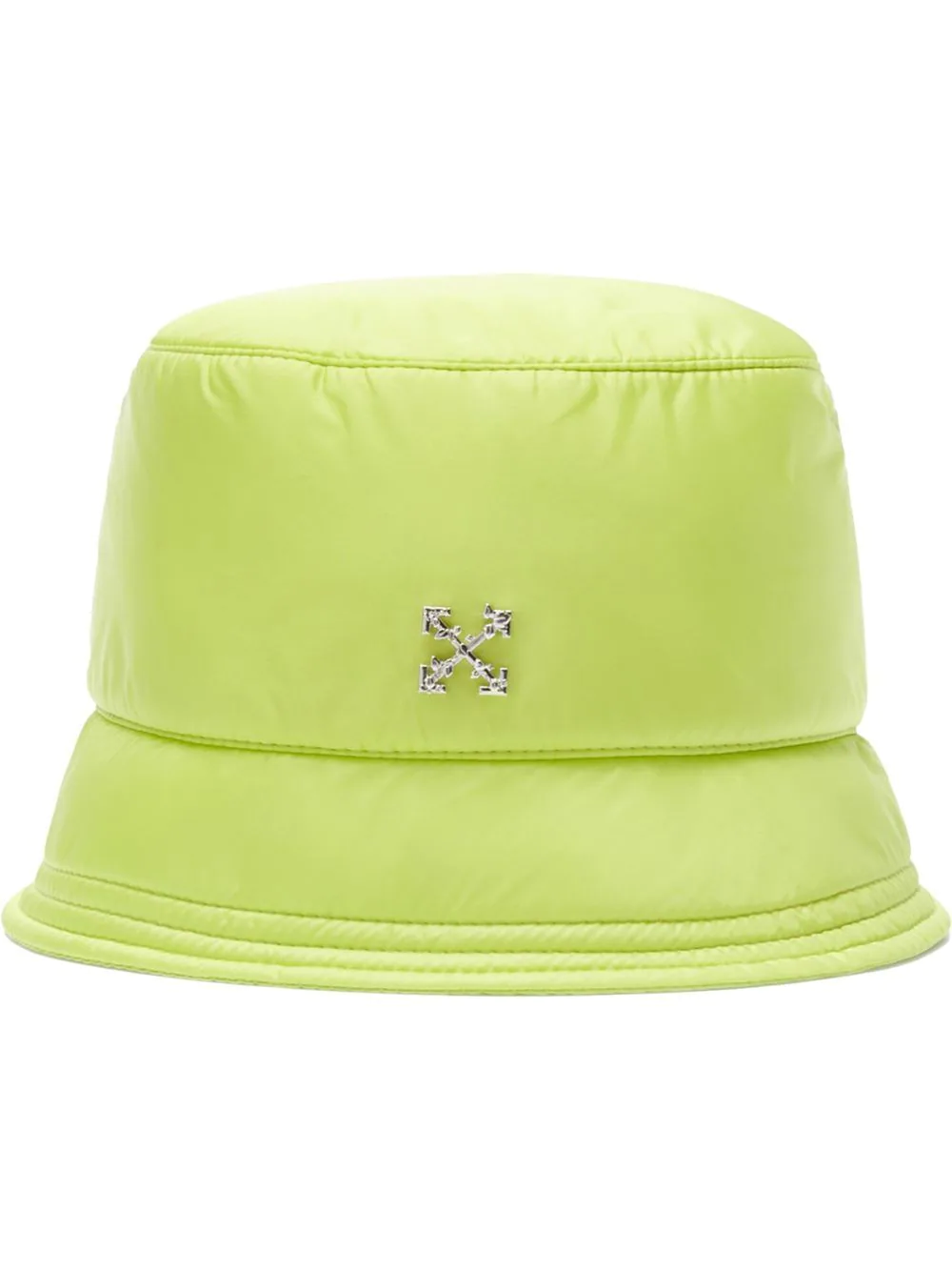 Off-White offers this vivid green bucket hat embellished with a silver-tone Arrows design as part of their ongoing commitment to unabashedly bold branding.