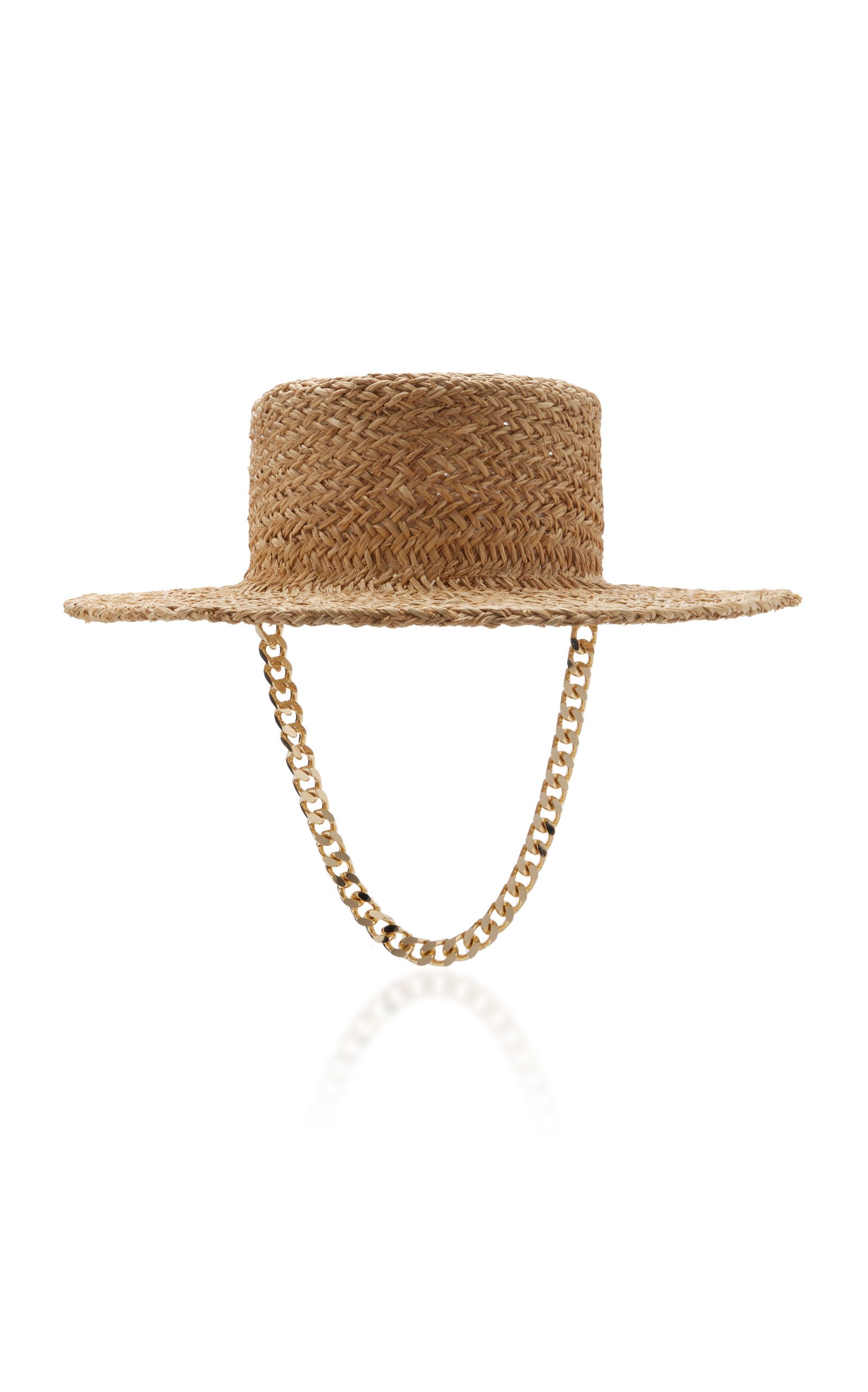 This pure straw wide-brim boater hat is handmade and adorned with a gold-tone chain.