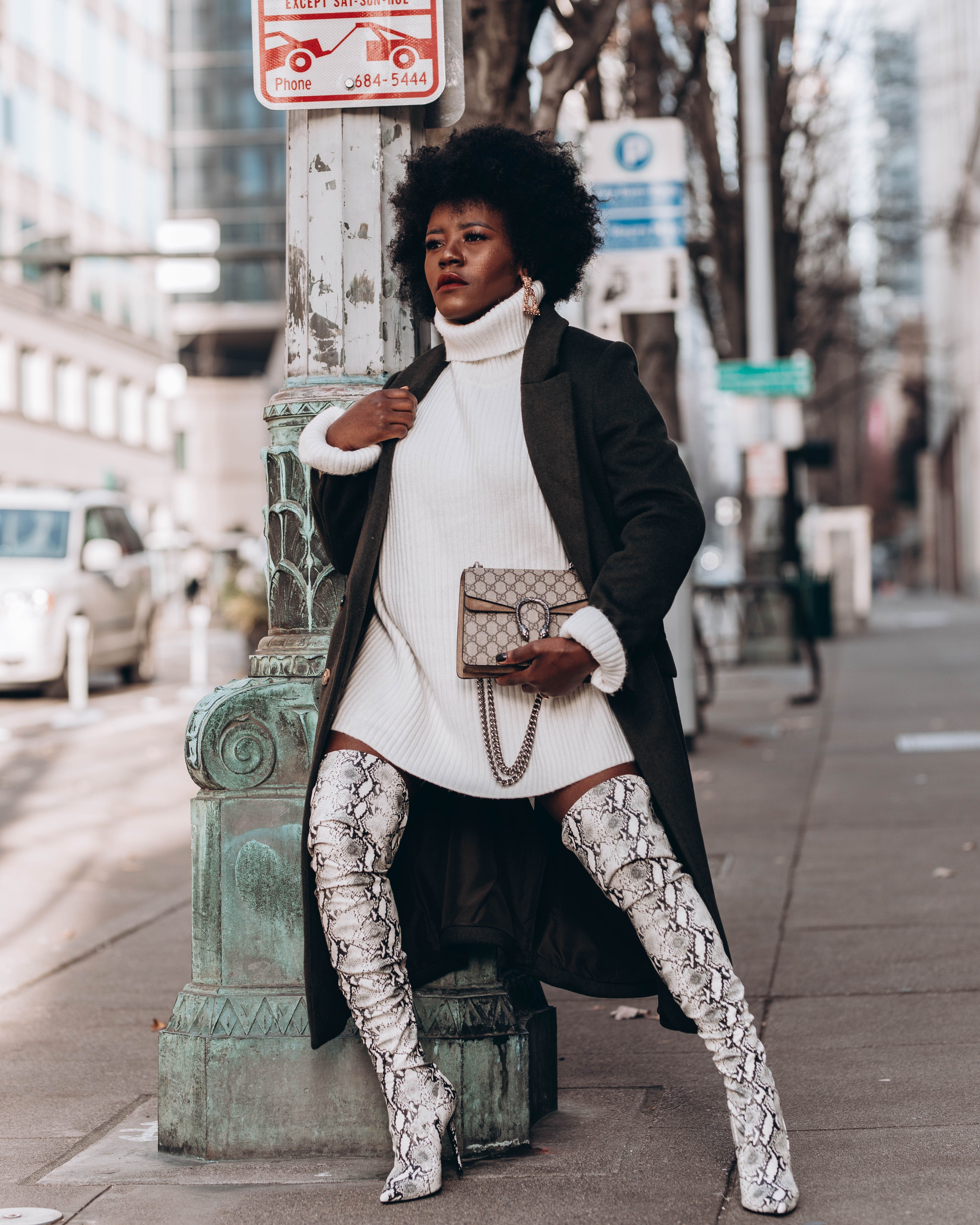 While ankle boots are undoubtedly a fall staple, thigh-high boots create a longer visual line. To amplify the effect, avoid showing a gap of skin with a dress or skirt that boasts a longer hemline that covers the top edge of the boot.