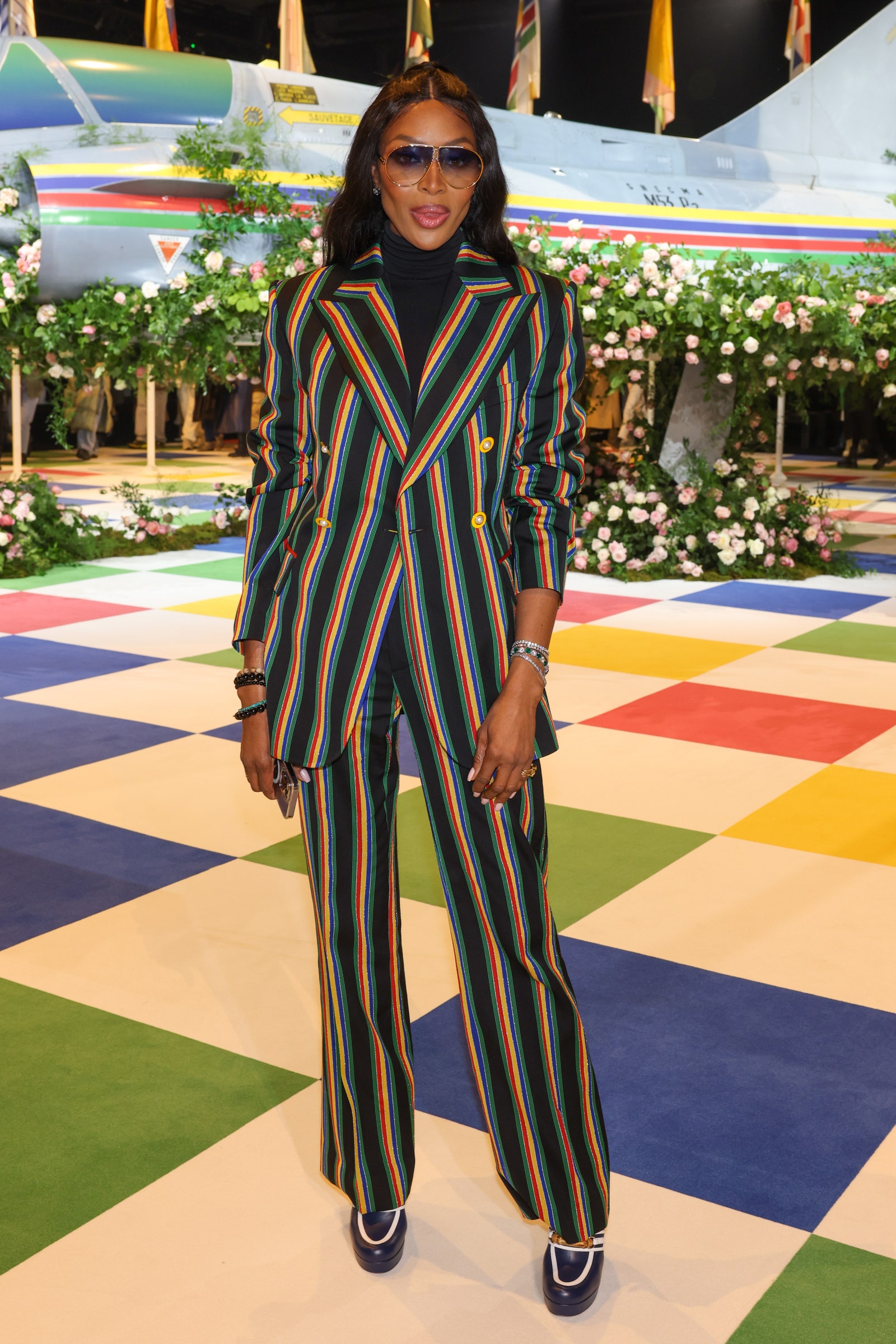 For her second quick change before the Casablanca show, Naomi wore a rainbow-striped suit and heeled loafers to match the set’s vibrant checkerboard pattern.