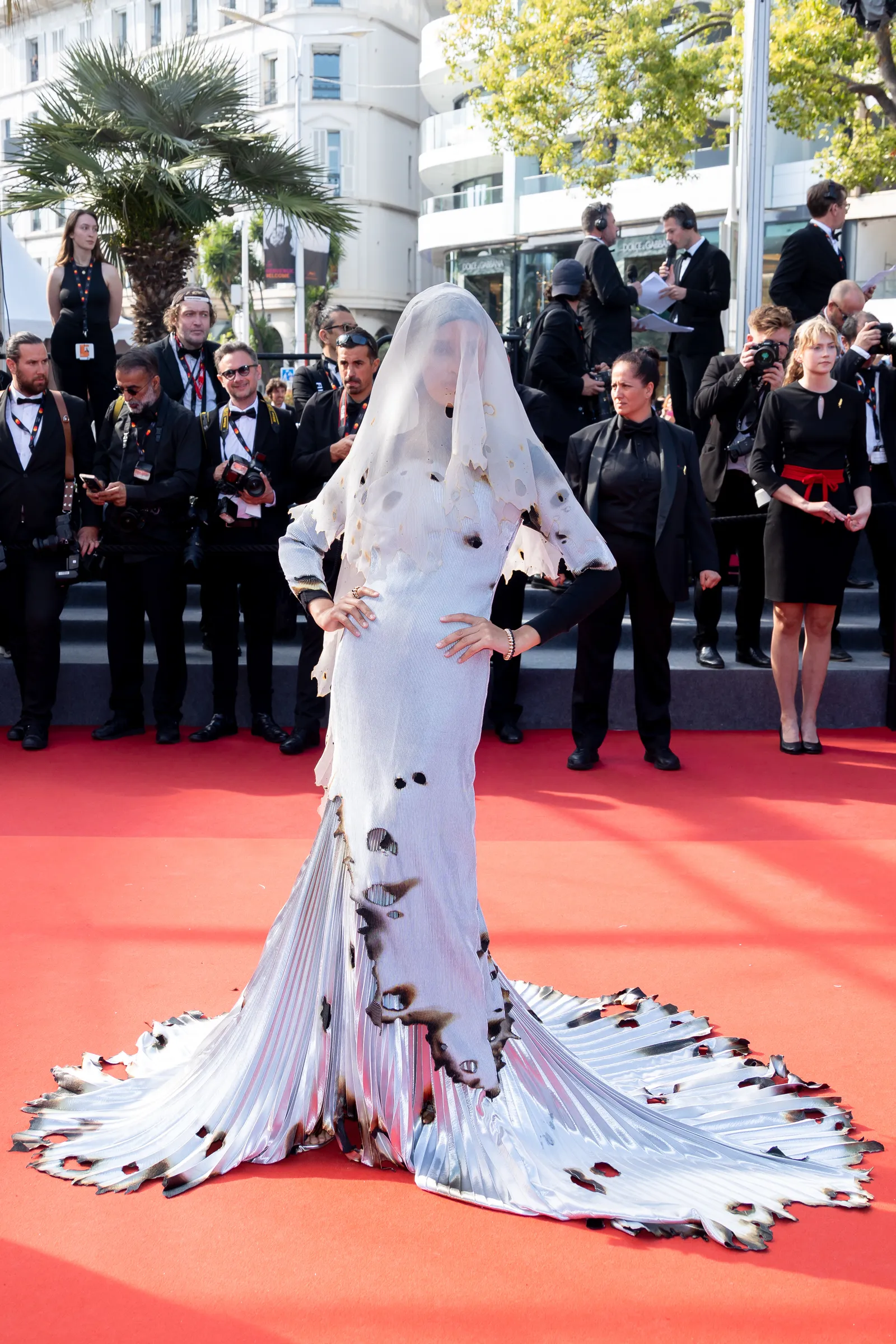 In a plunging semi-sheer, gold-embellished gown on May 16.