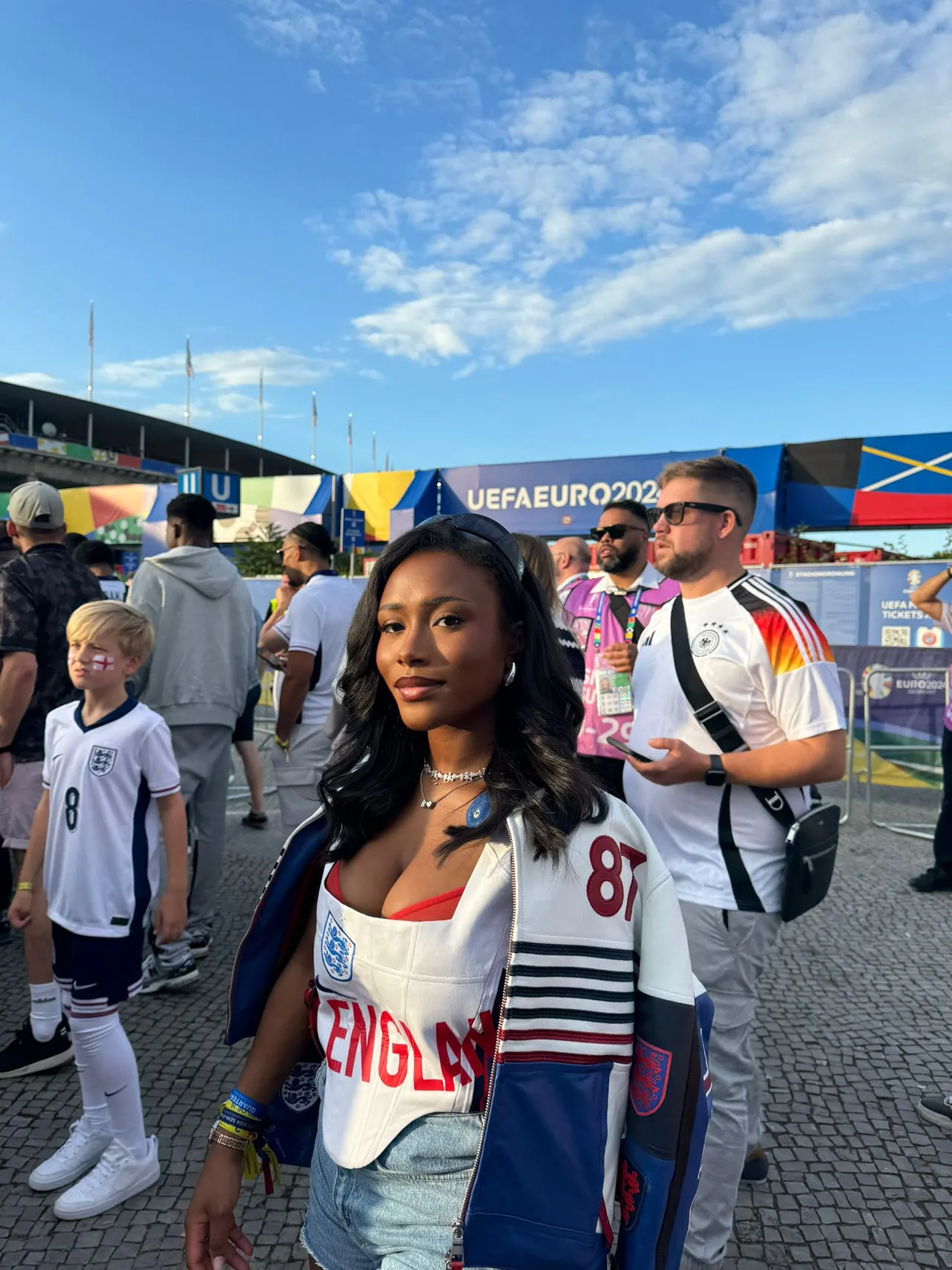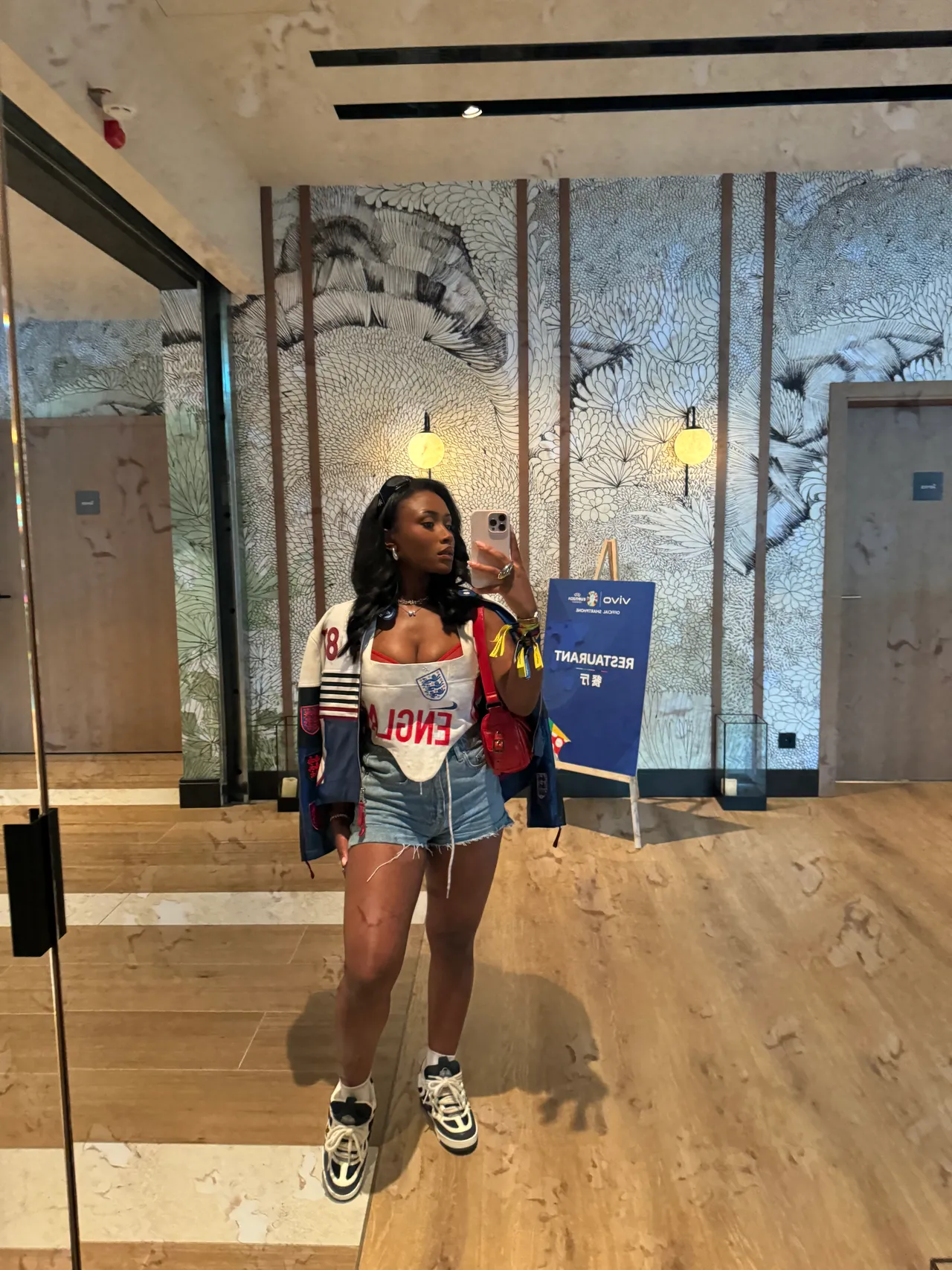 Tolami took to Instagram to flaunt her freshest ensemble for the big game, showcasing a sleek white bodysuit adorned with the iconic three-lions crest, paired with denim shorts, a stylish jacket, and trendy sneakers. Collaborating with fashion designer and soccer aficionado Hattie Crowther, the dynamic duo crafted a unique and exclusive outfit specifically for the match in Berlin. The corset was designed from a repurposed jersey for the Euros 2020/2021 Nike kit, featuring the number 87, which was Bukayo’s number for Arsenal during the 2018/2019 season—incorporating it on the back of the corset.