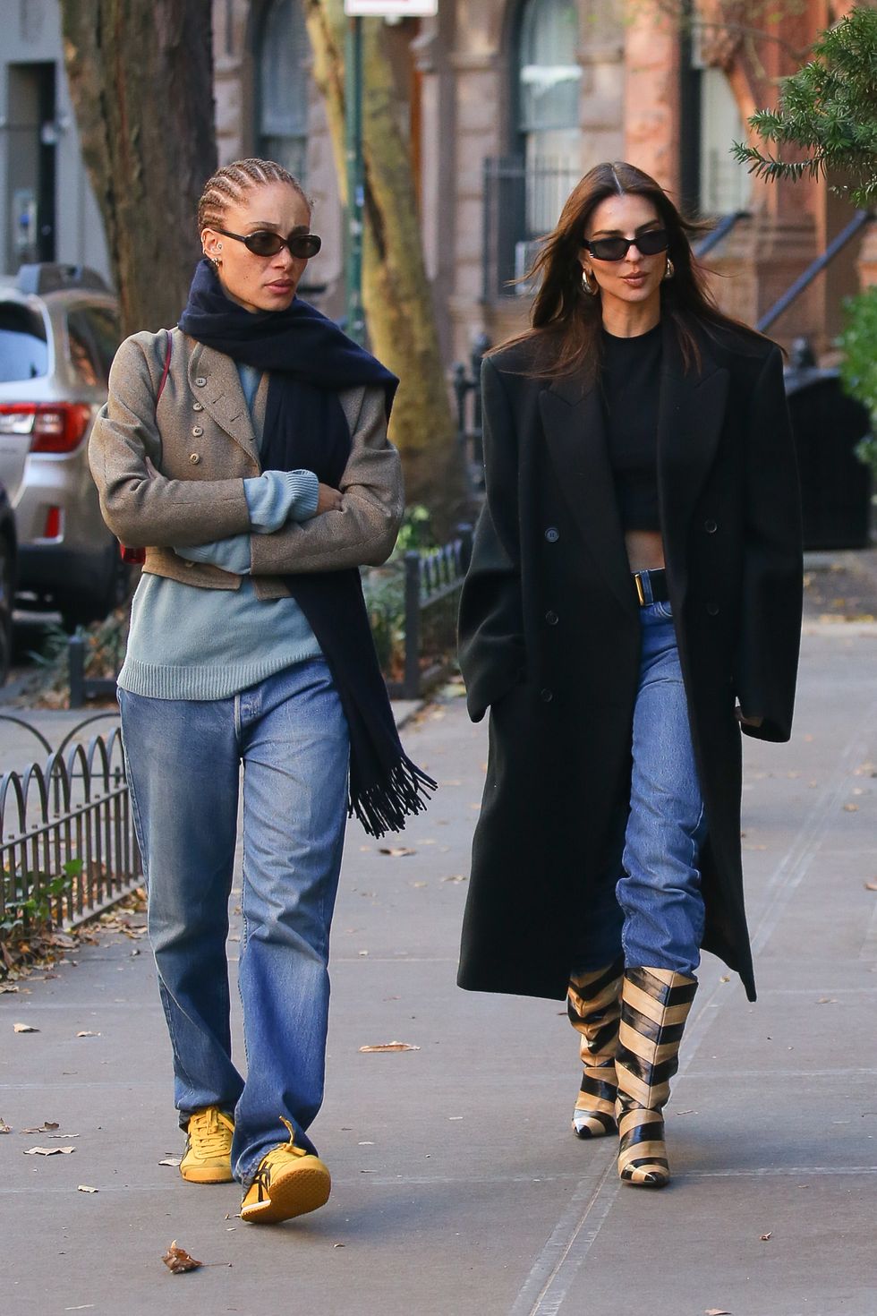The model had recently worn a classic long black wool coat iteration with paired dark wash jeans with and cropped black tee while taking a stroll with Adwoa Aboah, who wore a blue knit sweater, cropped brown jacket, navy blue scarf, dark wash straight-leg jeans and yellow Asics sneakers. Emrata paired her jeans with eye-catching brown-and-tan striped leather boots, chunky gold hoops, and black square-frame sunglasses.
