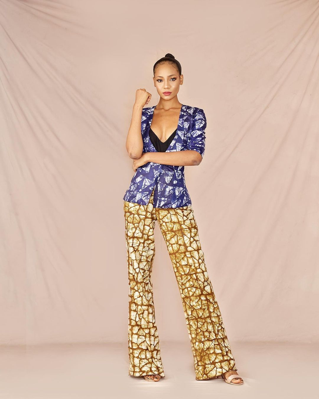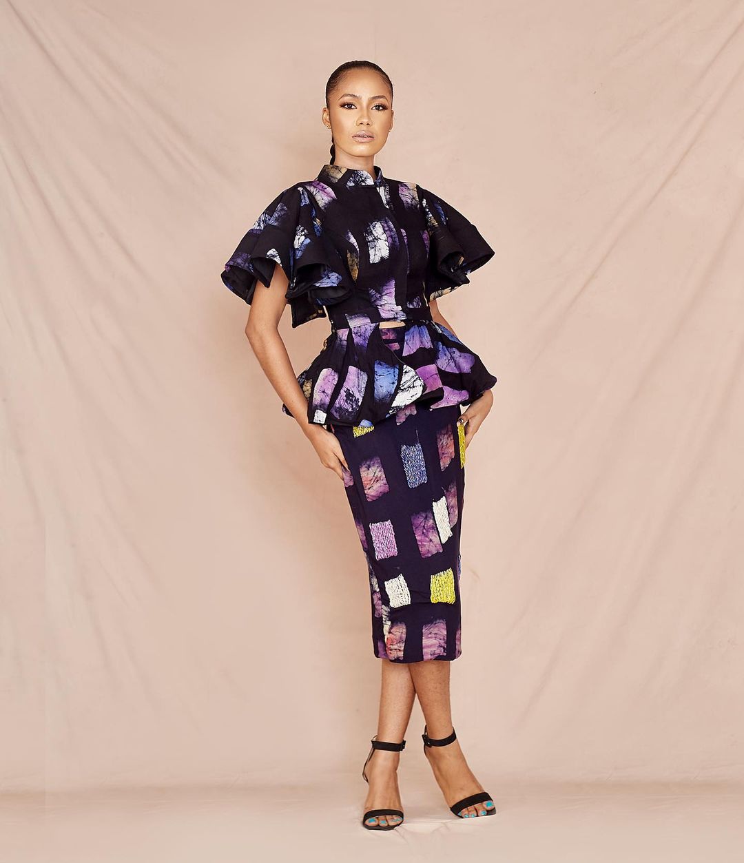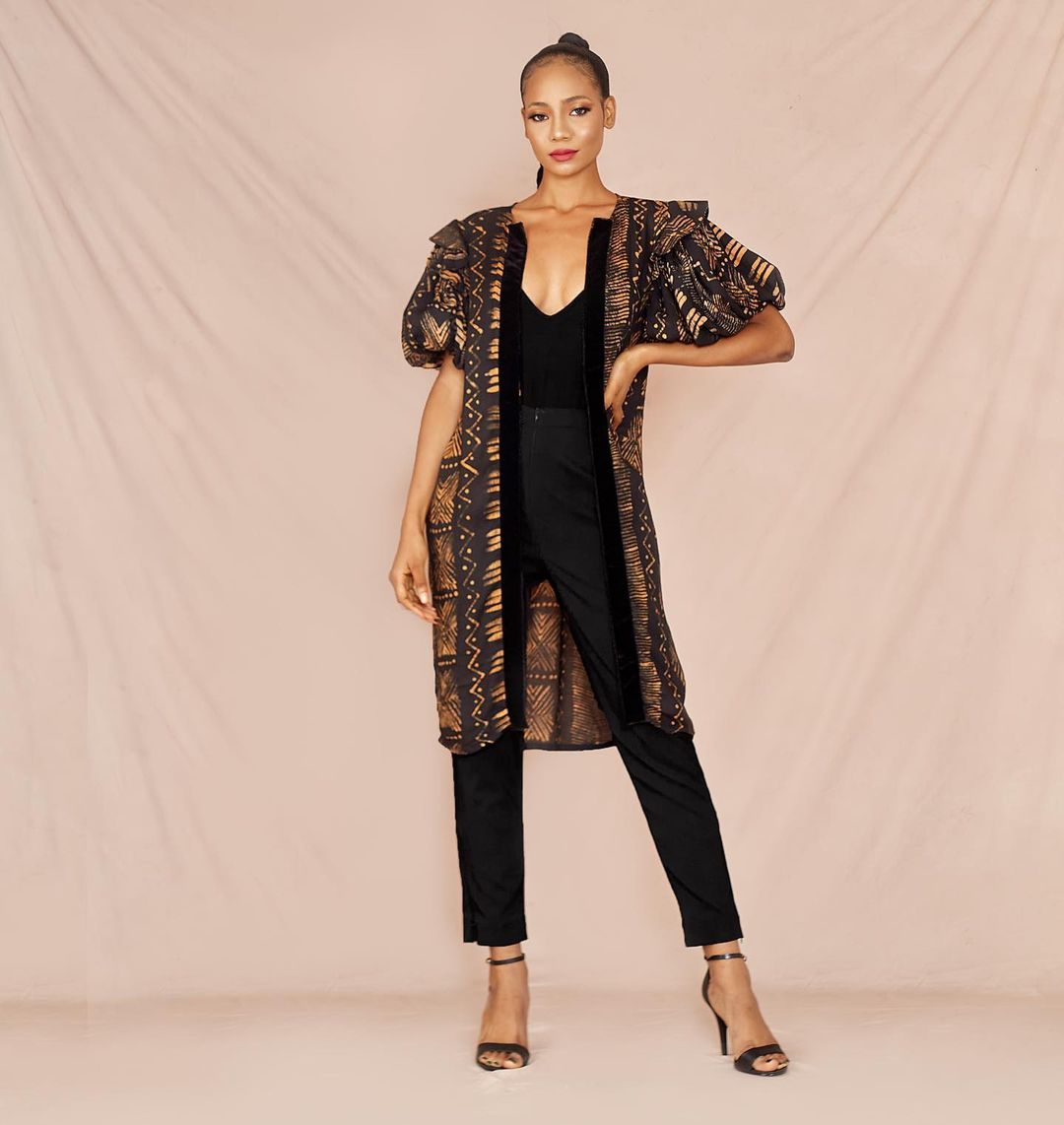 The Adewunmi is your power suit with a sass. The water color infuses colors and depth. The jacket is volume with the perfect want synch. The jacket without the skirt black pants or with the beaded skirt; the beaded pencil skirt balances the volume on top for the perfect silhouette.