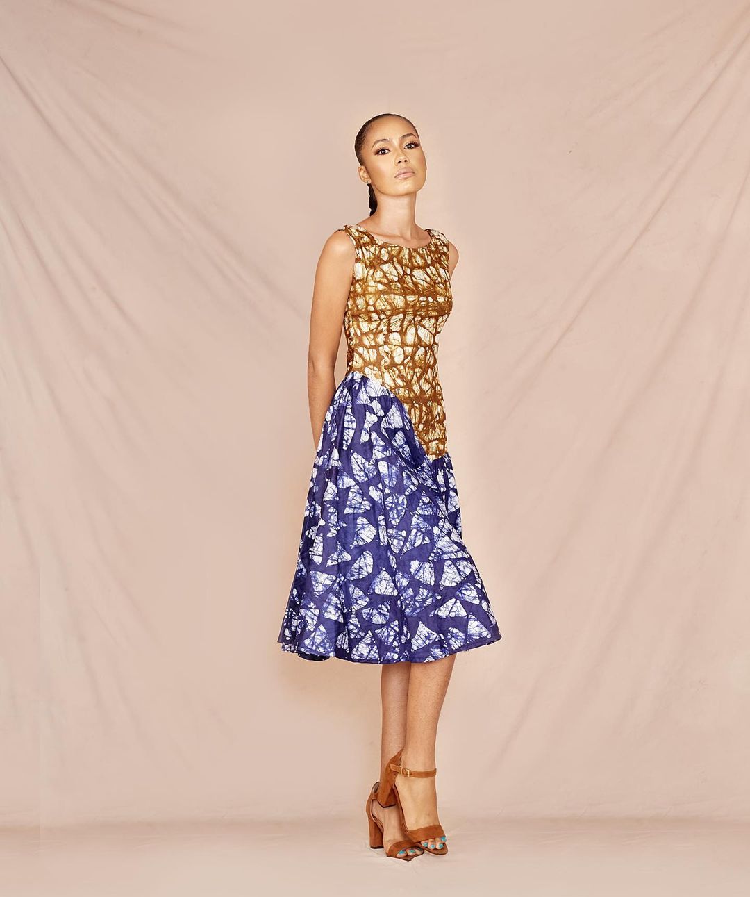 The Aderemi Dress is a V neck blue flared dress, detailed with a contrast of a similar yellow print, constructed with cold shoulder sleeves and pleated details at the edge of each side of the dress.