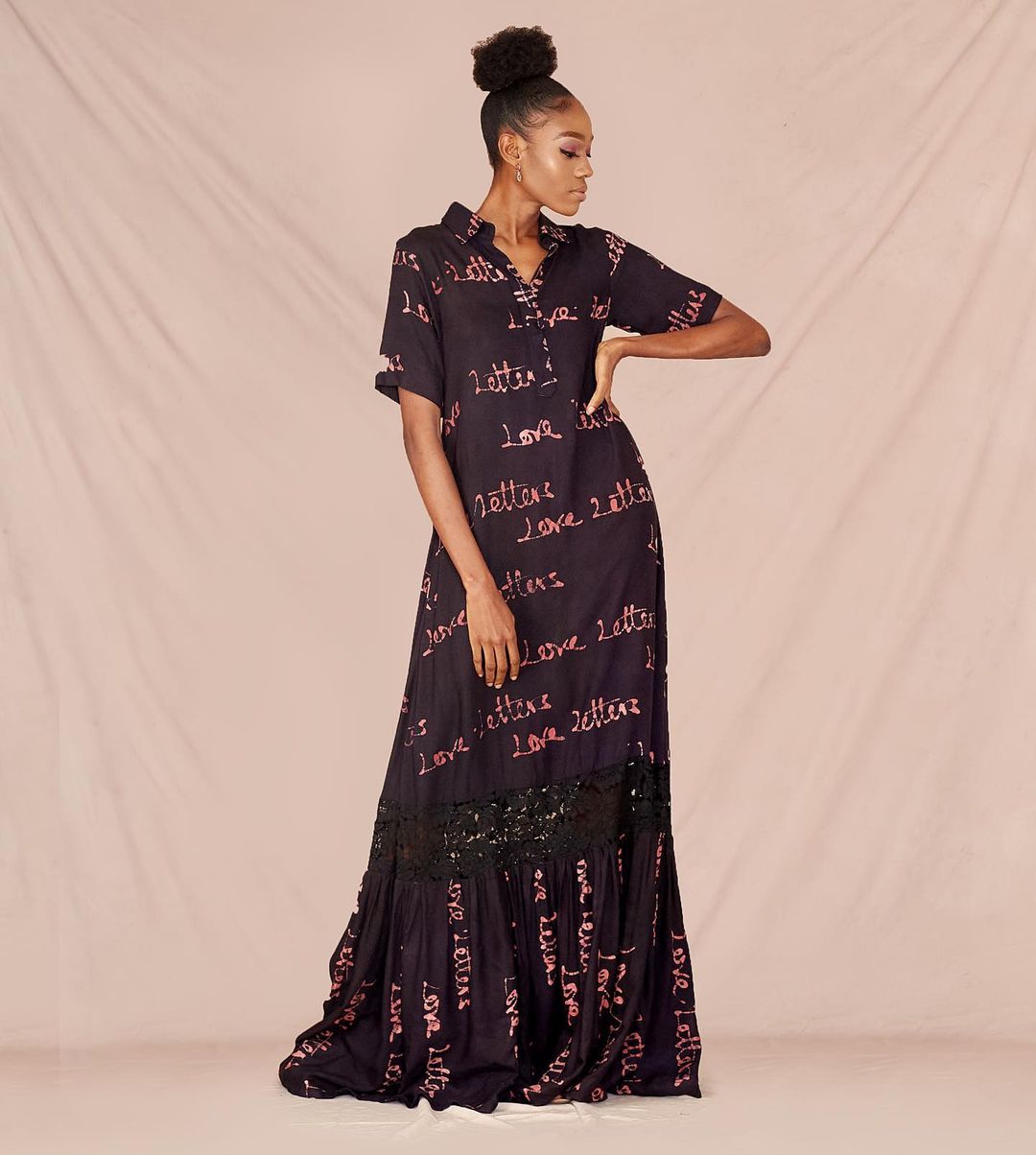 The Rahamah is a graphic love letter print shirt dress with a peek of lace . Soft, fluid with pockets for that relaxing feel.