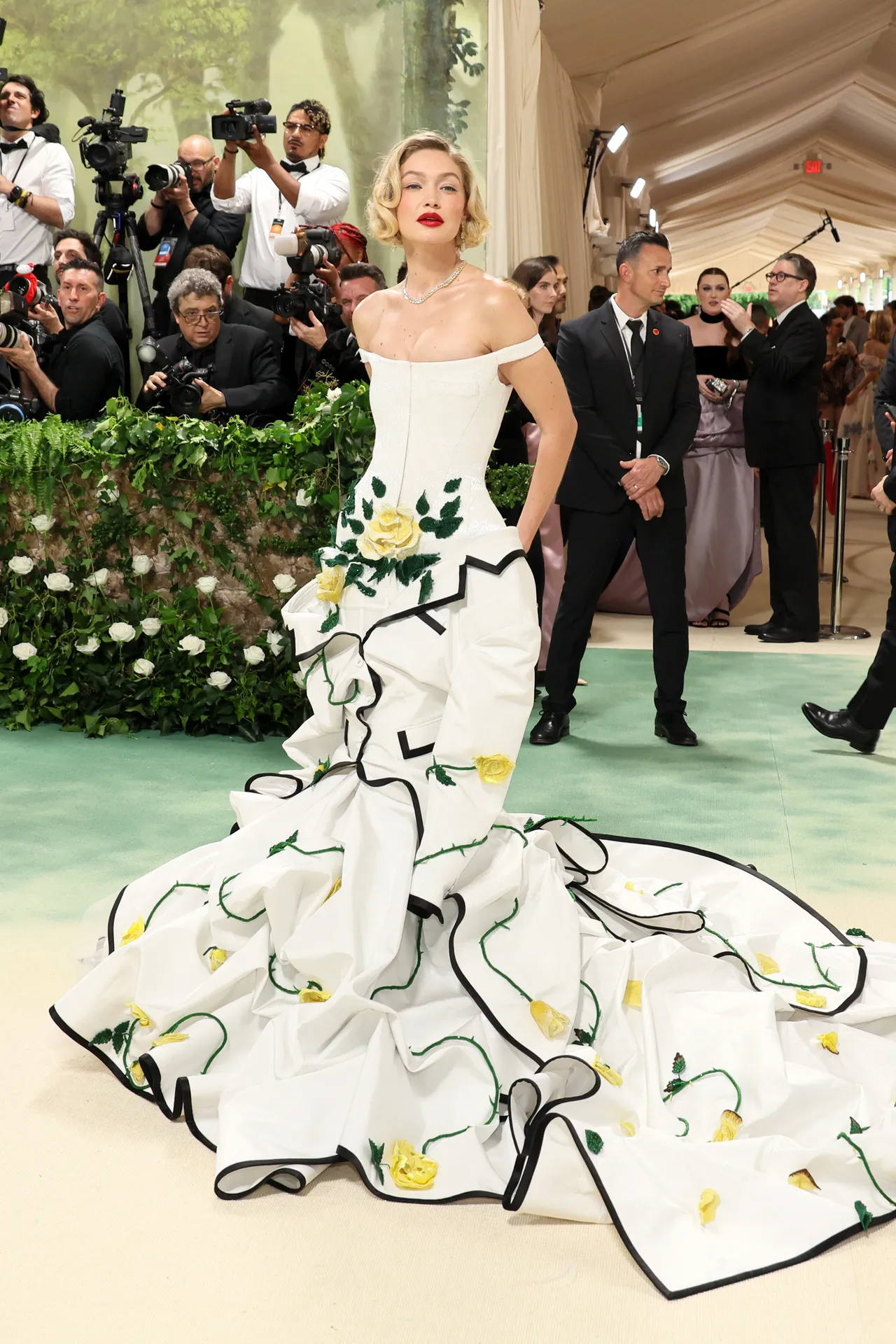 Sure to impress, she wore a white off-the-shoulder corset dress with exaggerated hips, layered underneath a white silk moiré coat with black duchesse satin tipping. An embroidered yellow rose with black petals at the waist and other roses adorned the skirt, flowing onto the carpet. Gigi also carried a bouquet of yellow roses to match the outfit.