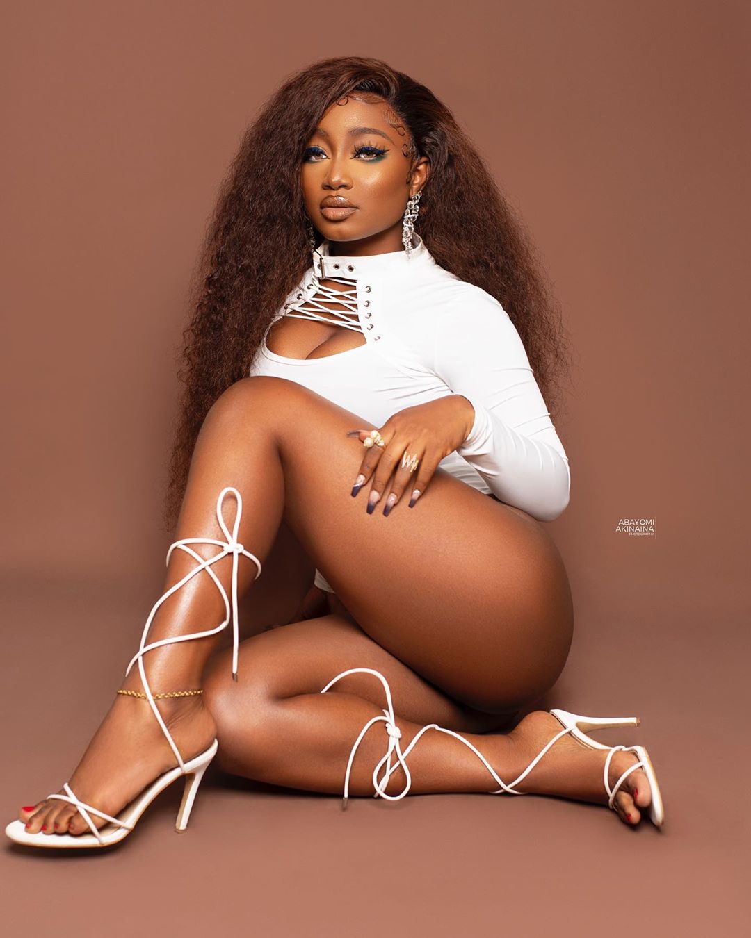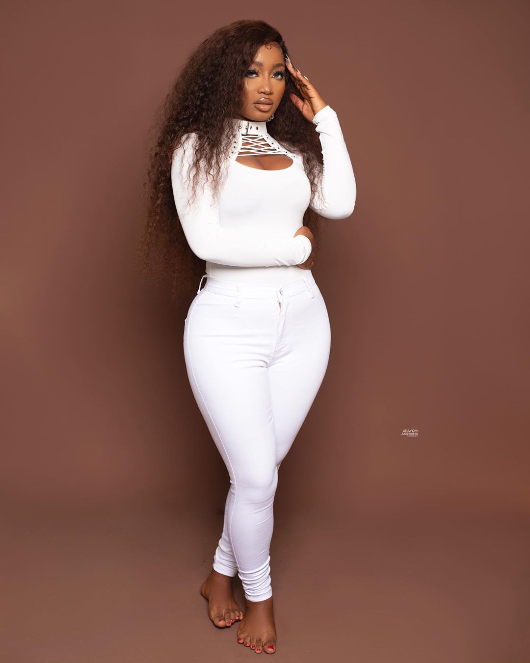 Sexy and Glowing, the Ex BBNaija star looked absolutely breathtaking wearing a white leotard paired with matching lace up heels knee high in one snap and a matching pants, barefoot in another.