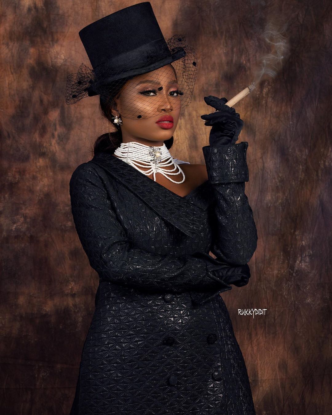 Wearing matching sequinned jacket and hat in another post with lit tobacco cigar. While it’s not known if the star actually smoke or it was meant for artistic purposes, all we can say is that Esther Biade looked smoking hot.