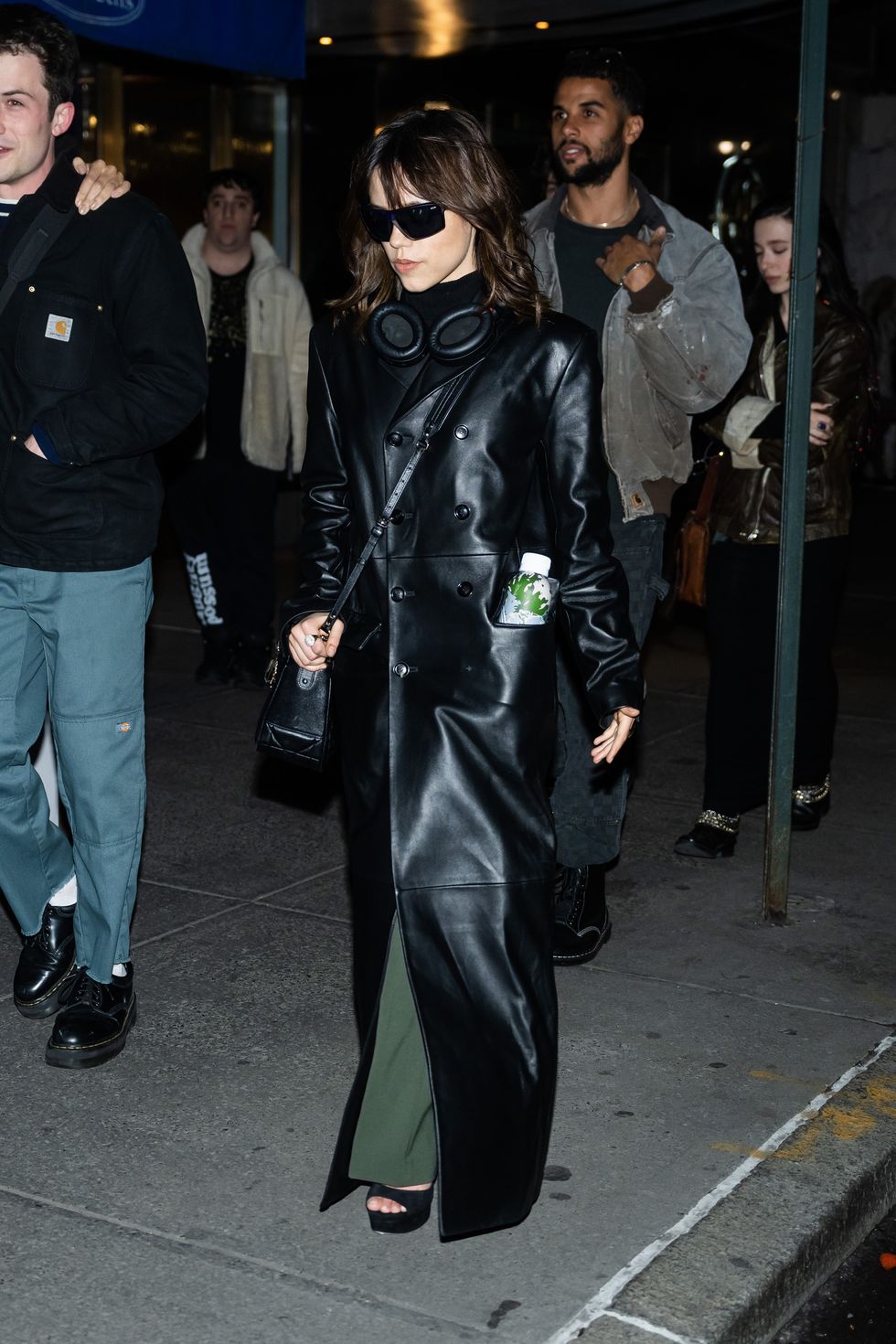 The actress, who gained notoriety for her major part in the television series Wednesday, was spotted last Sunday strolling across the city wearing a black leather trench coat by Filippa K that reached her ankles. She accessorized the striking piece with a black dress, matching shoulder bag, matching sandals, and black sunglasses.
