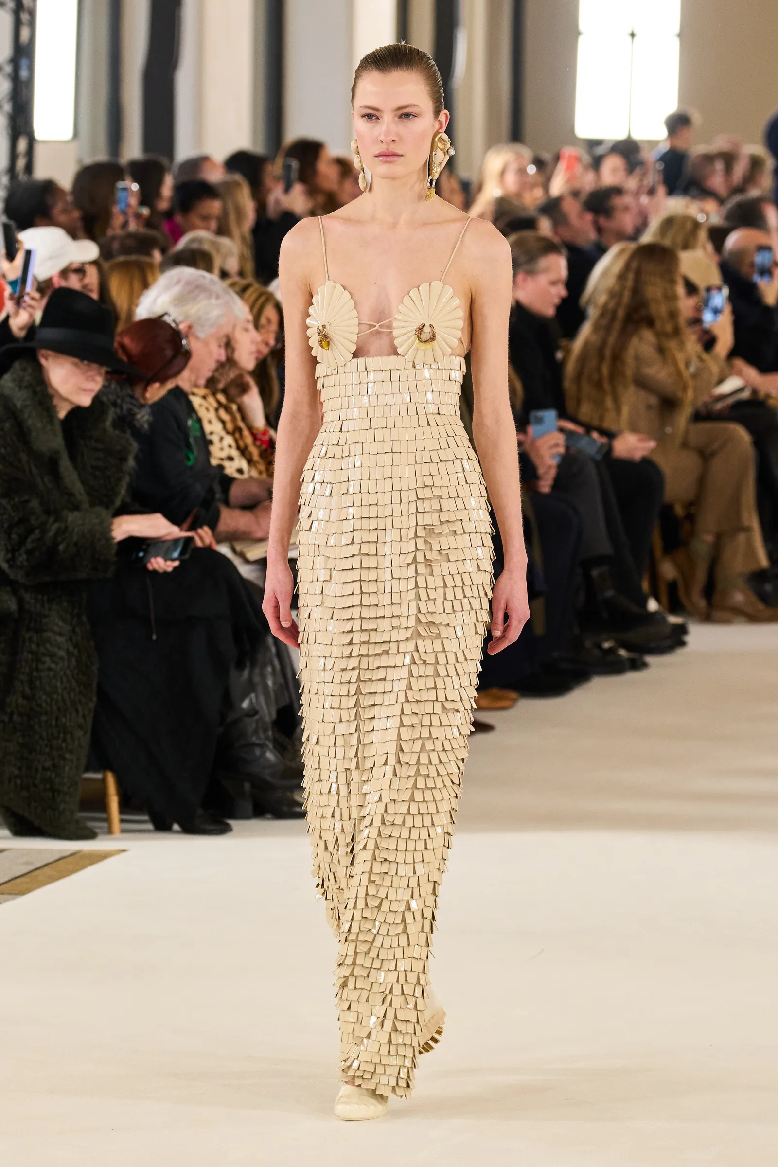 And for the Vanity Fair’s 2023 Oscars Afterparty, Naomi Campbell stood out in a straight-off-the-runway look. Daniel Roseberry created the look for Schiaparelli’s spring/summer 2023 haute couture collection. With a figure chugging bodice, the a cream dress was adorned with artfully placed paillettes, flowery breastplates, and gold nipple metal embellishments. Layers of 18 carat gold Briony Raymond necklaces, a bold bangle bracelet, and a pair of bare-toed shoes were the finishing touches for Naomi’s ensemble.