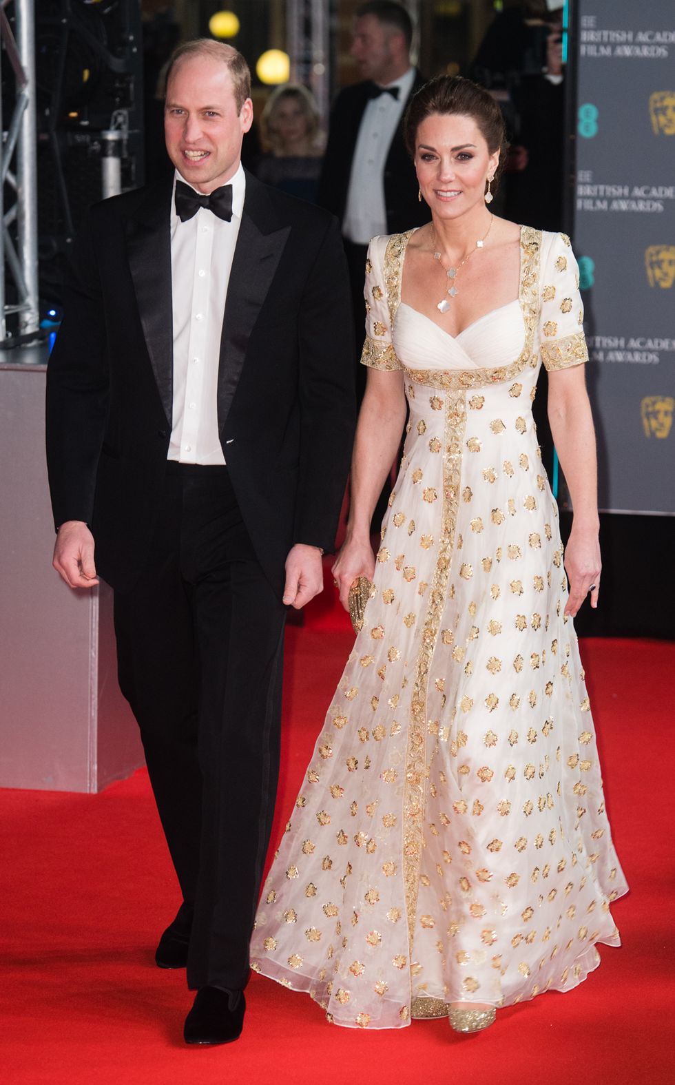 A pair of shoulder-length gloves further enhance the spectacular appearance of the monochromatic ensemble. Kate completed the ensemble with a set of elaborate drop earrings made of rose-gold petals and a rectangular black clutch that matched the gloves. While, William who has presided over the British Academy of Film and Television Arts since 2010 wore a standard tuxedo that featured a velvet piece, black suit pants, a white shirt, and a black bow tie.