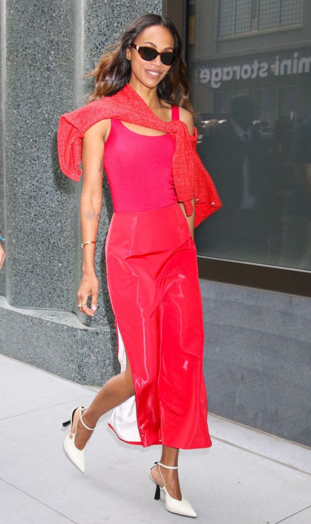 While weaving through the streets of Manhattan on Wednesday, Saldaña cut a striking figure in an all-red ensemble that seemed to rise from the city pavement like a flare. The look—a vermillion dream courtesy of Gia Studios—consisted of a sharply tailored pencil skirt with a daring thigh-high slit, paired with a sleek tank and a matching knit sweater, casually draped over her shoulders in a nod to uptown prep meets downtown polish.