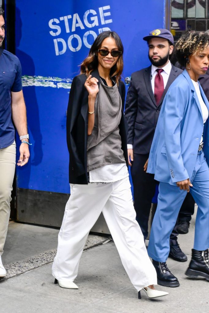 But the actor wasn’t in town just to turn heads—she was here on official fashion-business. Promoting her upcoming animated feature Elio, Saldaña made the rounds on daytime TV, serving up a secondary ensemble that proved her mastery of tonal balance. For Good Morning America, she softened her palette in a cloudlike blend of gray and ivory linen: a slate-draped top with raw-edge detailing tucked into wide-leg white trousers. Still present? Her signature Saint Laurent pumps, grounding the look in her signature polished ease.