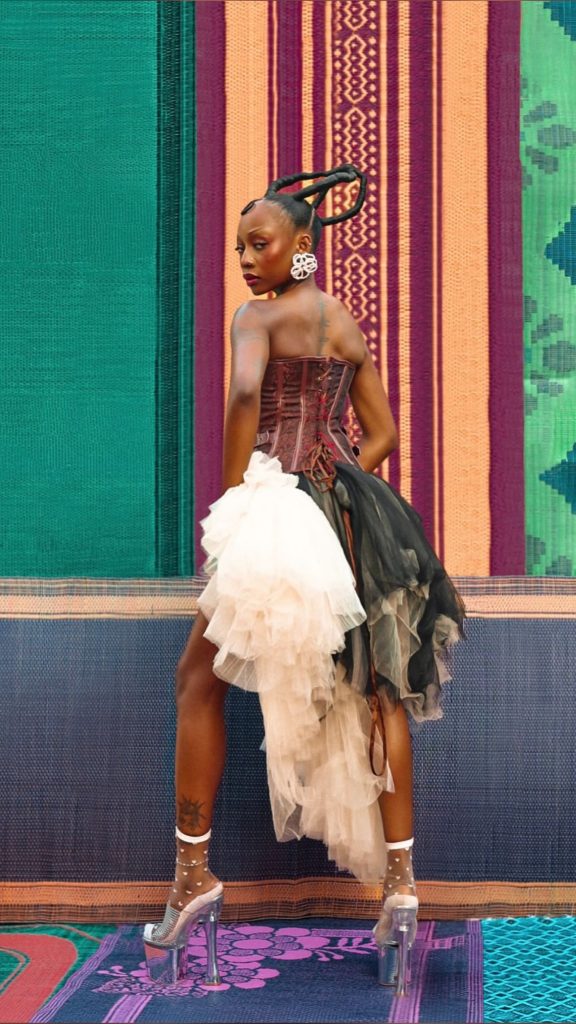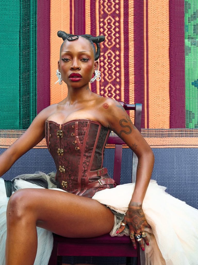 And behind her, those African textiles—rich with geometric pattern and chromatic audacity—create a world where this silhouette makes perfect sense. Ash OK does not disappear into this backdrop; she emerges from it, a figure from future folklore, from mythology not yet written. The purple chair, the layered rugs, the very texture of the walls: all conspire to frame her as artifact and prophecy simultaneously.