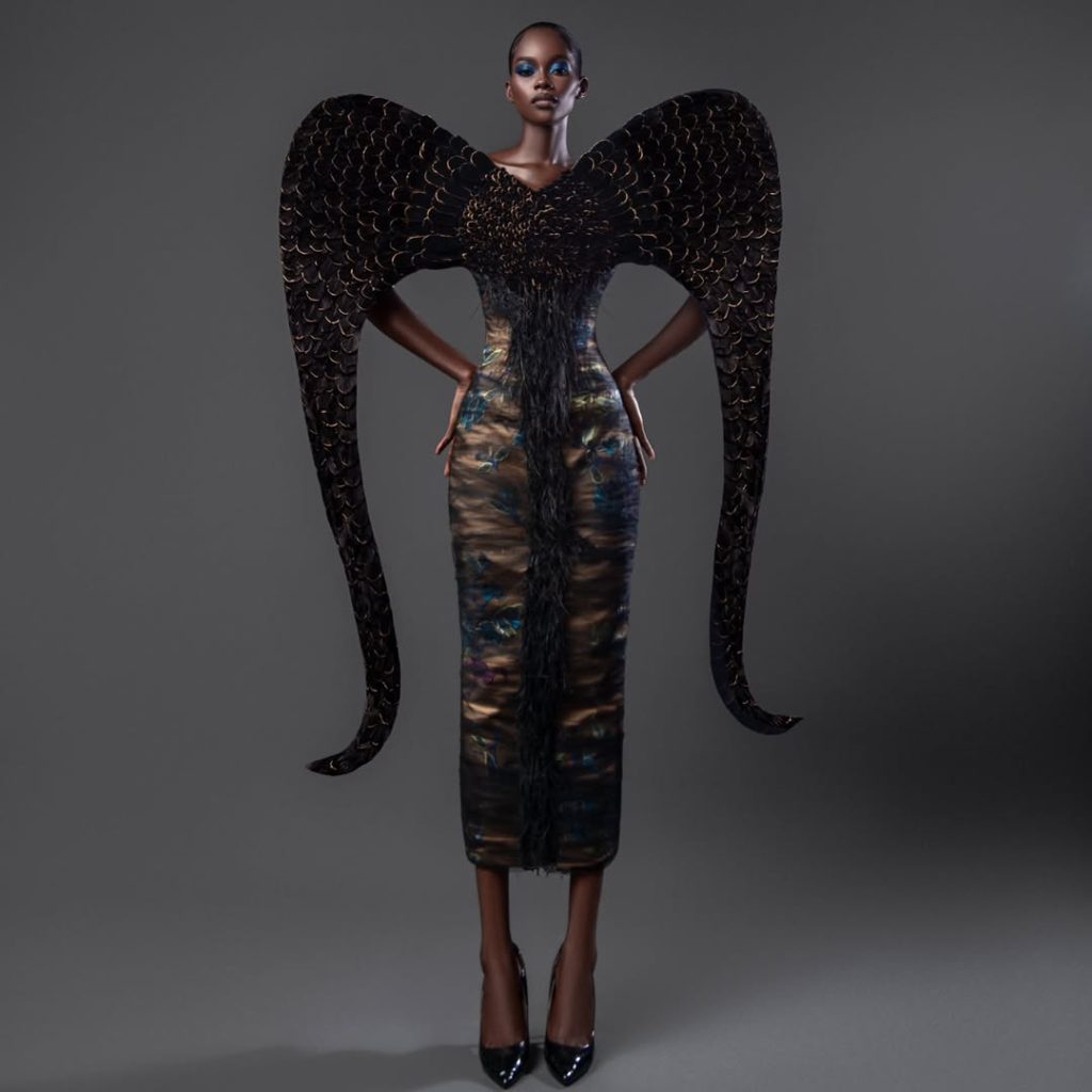The collection operates in the space between avian mythology and architectural engineering, between the lightness of flight and the weight of craftsmanship. Dhurm Franklyn has built a reputation for silhouettes that defy the body’s natural boundaries, and this season pushes that investigation into territory that feels simultaneously primordial and futuristic—couture for a civilization that has not yet arrived but whose dress codes the designer is already inventing.