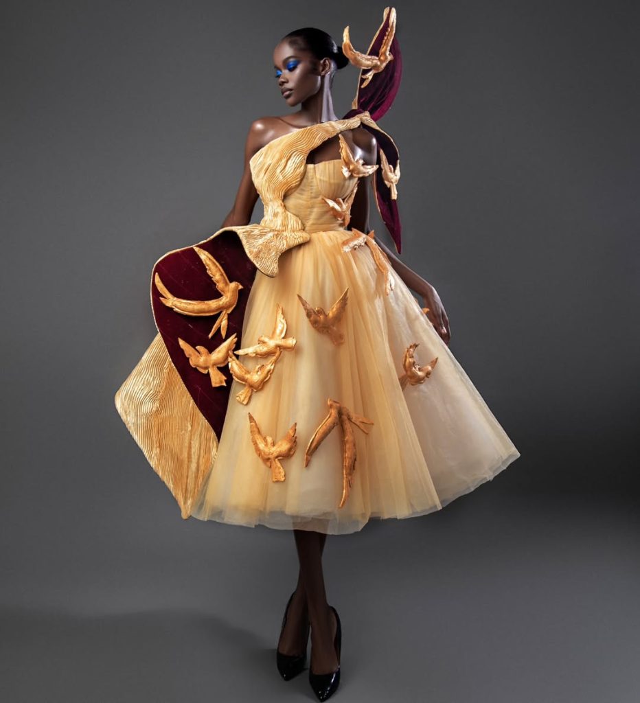 In the rarefied atmosphere of global couture, where heritage houses trade on century-old archives and established codes, Weiz Dhurm Franklyn arrives as a disruptive composer—conducting not with baton but with needle, not with orchestra but with the human form itself. The designer’s Spring Summer 2026 collection, titled Melodies in a Feather, does not whisper its ambitions. It declares them through twelve looks that read as visual arias, each garment a crescendo of technical bravura and cultural storytelling.