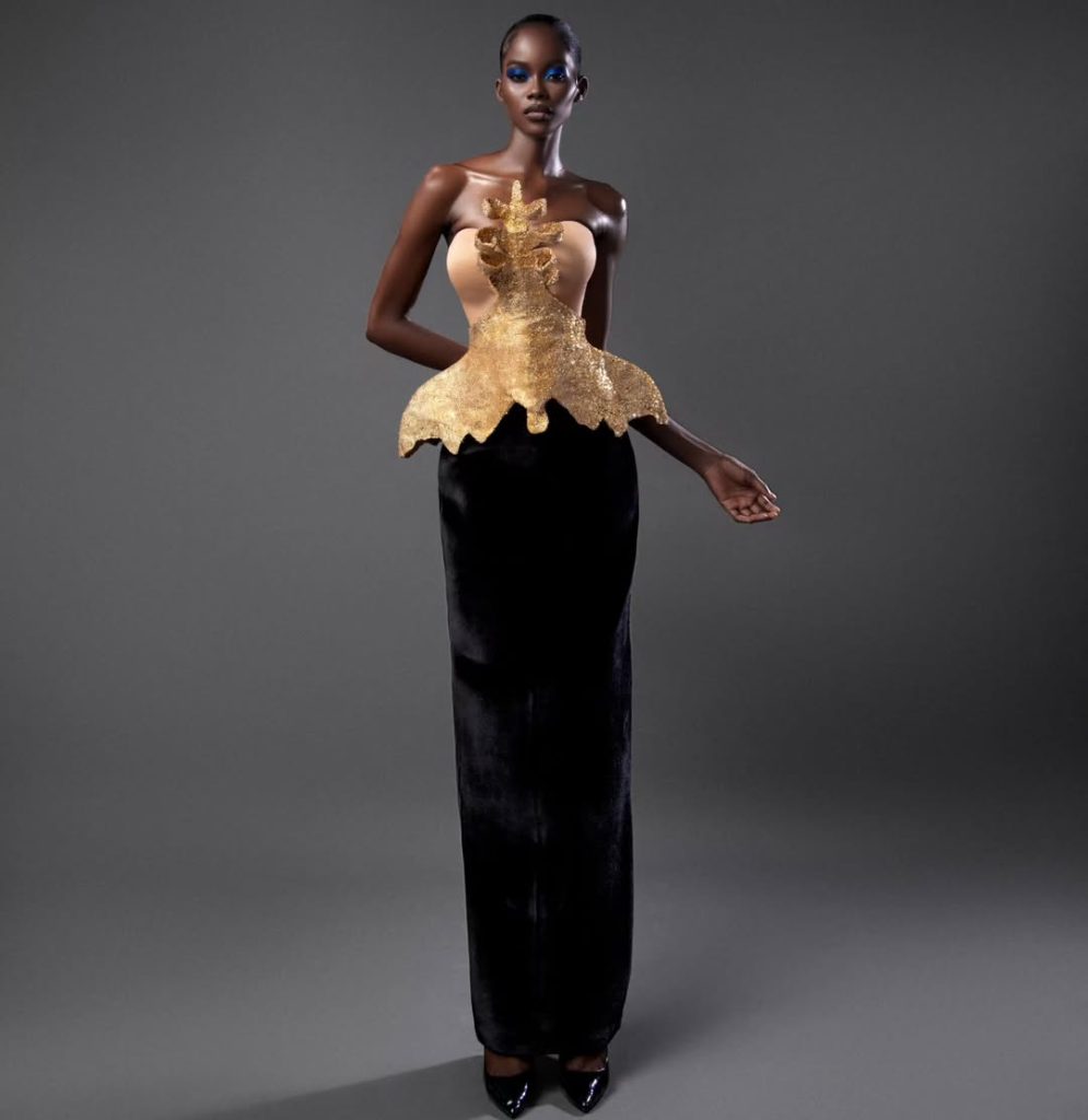 The opening look establishes the collection’s central dialectic: constraint and eruption. A strapless corset in liquid gold—beaded so densely it reads as molten metal rather than fabric—cinches the torso into an exaggerated hourglass that references both Victorian fetishism and West African sculptural traditions. The peplum flares with jagged, organic edges, as if the garment has grown rather than been constructed, while cascading from the waist is a tail of interlocking gold forms that suggest vertebrae, armor, or the skeletal structure of some mythological creature. Below, a column of black velvet provides the necessary visual silence, allowing the gold’s percussion to resonate fully. This is not a dress that accommodates movement; it commands it.