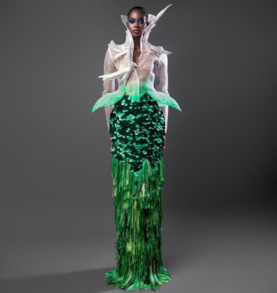 The fourth look ventures into translucency and transformation. An organza blouse in palest mint, its collar exploding into crystalline shards that frame the face like a halo of ice, gives way to a skirt of emerald sequins that shift from fish-scale density at the hip to fringed liquidity at the floor. The silhouette suggests mermaid mythology filtered through Nigerian coastal folklore, the upper body ethereal and vulnerable, the lower body armored and aquatic. The color progression—from mint to deep forest green—creates an ombre effect that implies the garment is still wet, still becoming, still in the process of evolution.