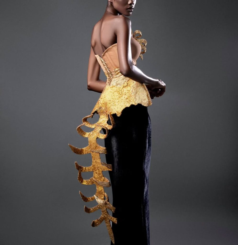 By the third look, Dhurm Franklyn introduces chromatic disruption. A strapless peplum in gold—shorter, more architectural than its predecessor—sits atop a floor-length velvet column. The innovation arrives at the neckline: a vertical structure of gold that suggests both phoenix plumage and Art Deco sunbursts, rising toward the collarbone like a creature preparing for ascent. The back reveals its secret—a tail of gold forms descending the spine, vertebrae rendered in couture, transforming the wearer into something between woman and wondrous beast.