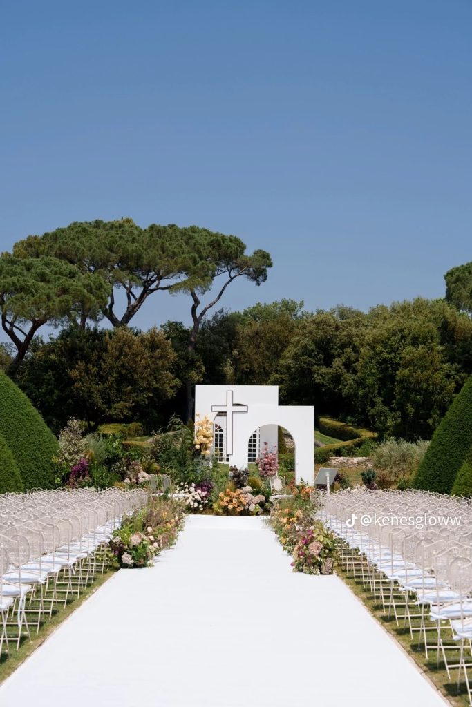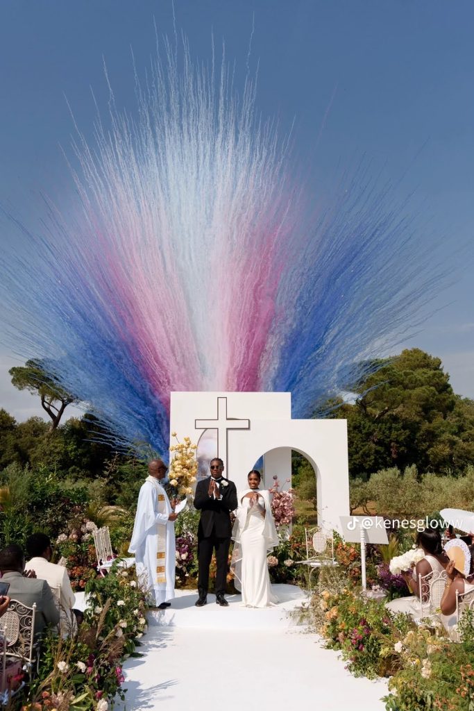 The ceremony, staged before an elegant white altar set against a stately French château, felt like a scene plucked from cinema. As the couple exchanged vows beneath the Provençal sun, a dramatic burst of pink and blue smoke erupted behind them, casting the sky in vibrant hues—an unforgettable visual metaphor for a love that was bold, brilliant, and entirely their own.