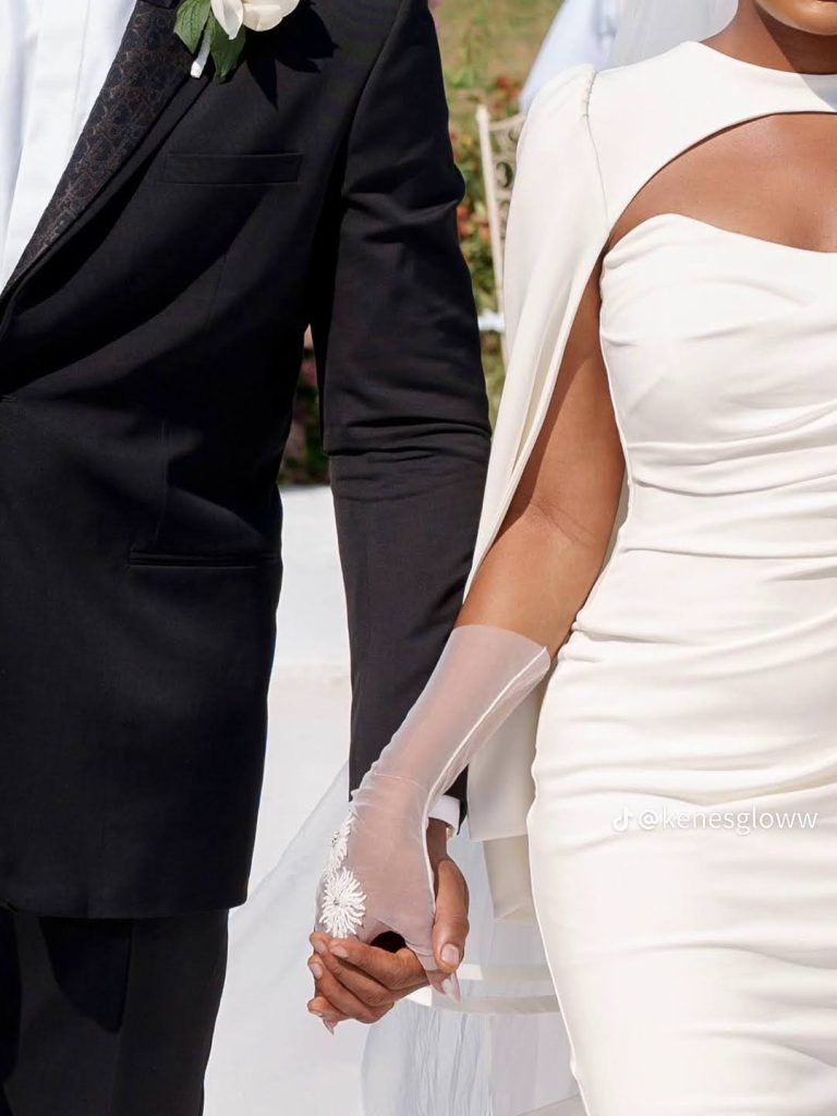 The bride was nothing short of a vision—otherworldly, arresting, unforgettable. Draped in a sculptural white gown that whispered of contemporary couture, the dress embraced her form in a mermaid silhouette, accented by a bold keyhole neckline and crowned with a sweeping, shoulder-fastened cape that billowed with divine drama. Her gloves—diaphanous tulle, embroidered with the subtlest white florals—spoke to a romanticism that was both nostalgic and entirely of the moment. A minimalist veil, classic updo, and glowing, understated makeup completed a look that was poised, powerful, and profoundly beautiful.